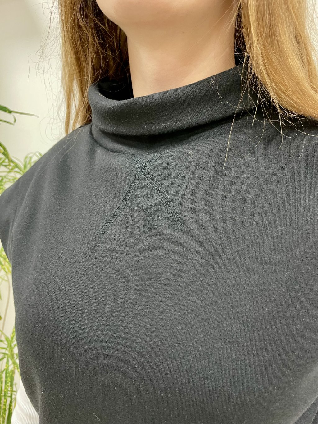 Je ušitá z měkké teplákoviny, má volnější střih a vyšší límec, díky kterému je příjemná na nošení v chladnějším období.